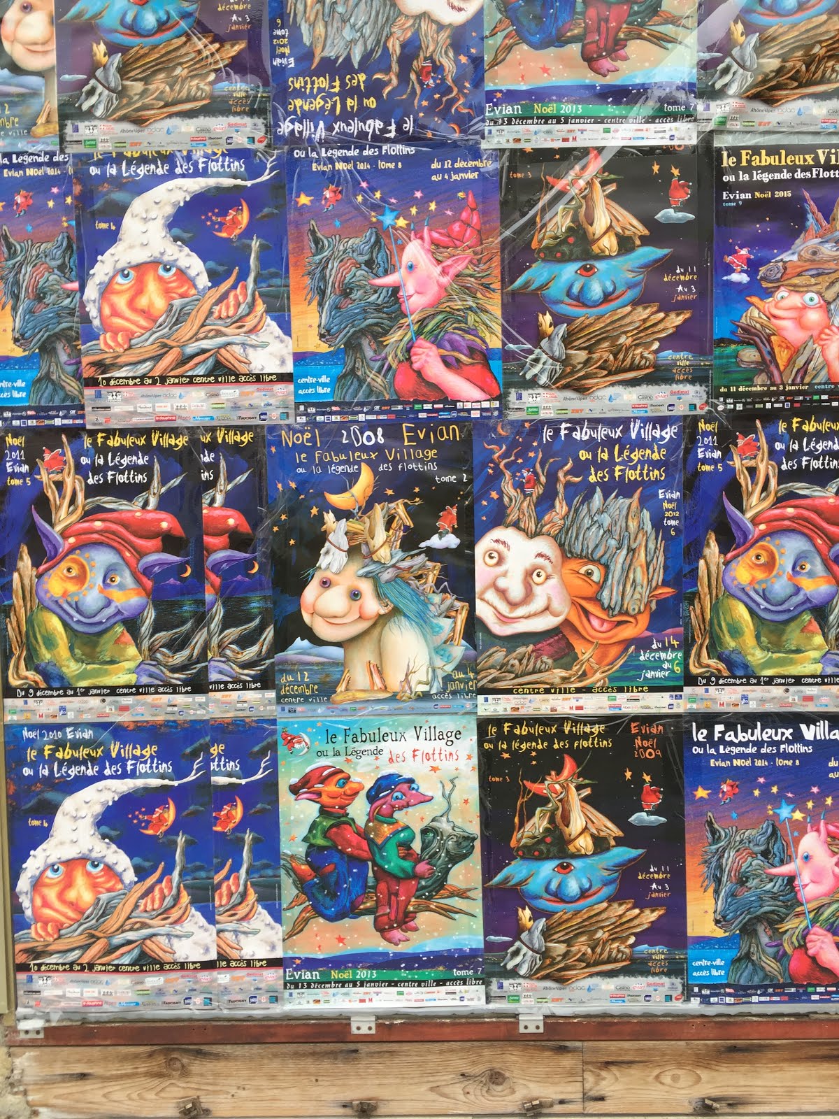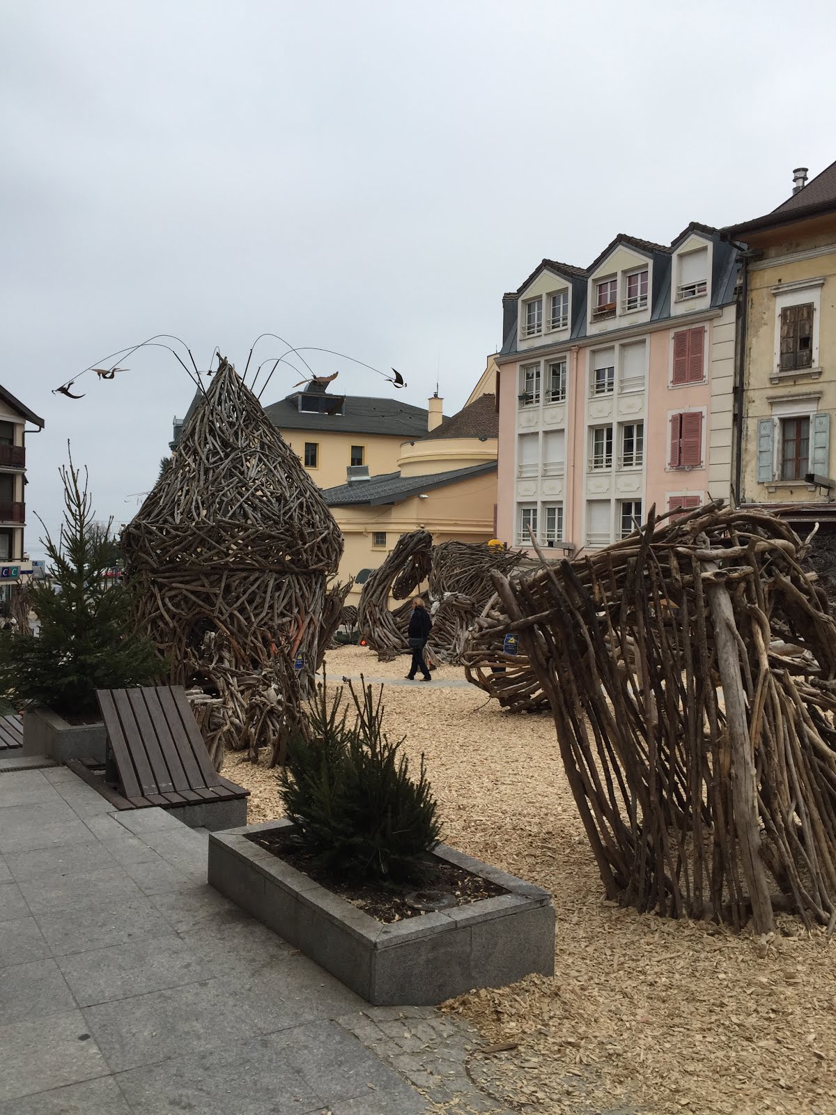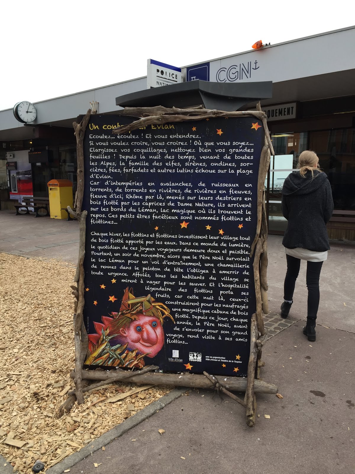 It was a cold winter's day, so cold that the spray from the lake had set solid on benches and around the tyres of cars and created dramatic temporary sculptures. It was definitely the sort of day where sitting by a fire or inside a café would have been more comfortable than strolling outdoors. Except that we were not just in Evian, we were in the Village des Flottins in Evian, where we encountered live elves and mystical (human) beings hanging out with enormous inanimate driftwood creatures. Legend has it that these warm and hospitable creatures, who arrive each year and set up their village in Evian, rescued Father Christmas and his reindeer after an altercation amongst the reindeer on a training run meant an urgent landing for Le Père Noël and his party in the waters of the Lake. He now stops in to see them annually as he is passing by.
