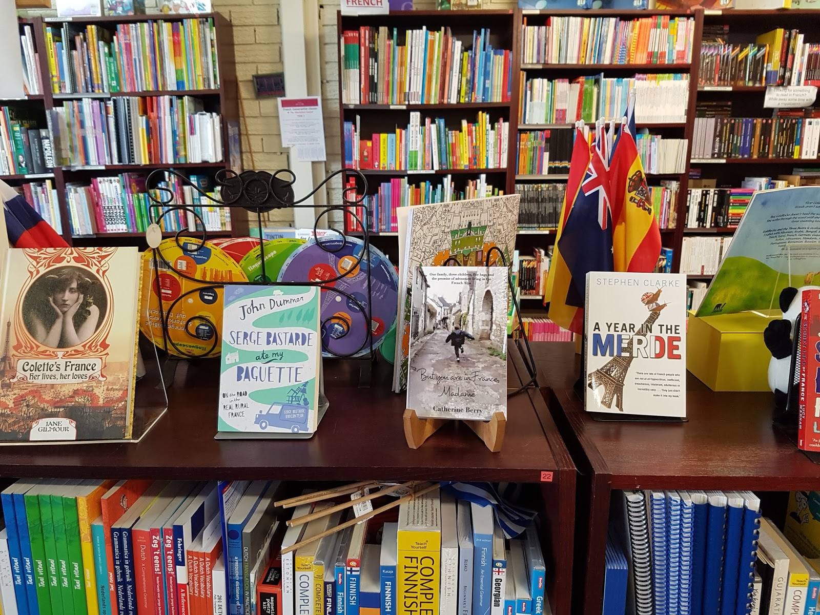 A few things have brought a smile to my face recently.... I reached 100 K views on my Google plus page, there was a slowing down in the number of Instagram followers who were deserting me each day (my daughter keeps telling me to stop taking social media so personally), the banner and publicity material that I had ordered for my market stall arrived and looked, to me anyway, beautiful and exactly as I had hoped, the flyer for my book talk at the library was finalised, and the attendees for the talk itself ran to a waiting list with a full-house on the day. But, nothing compared to having 'But you are in France, Madame' placed on the shelves of a proper bookstore.
