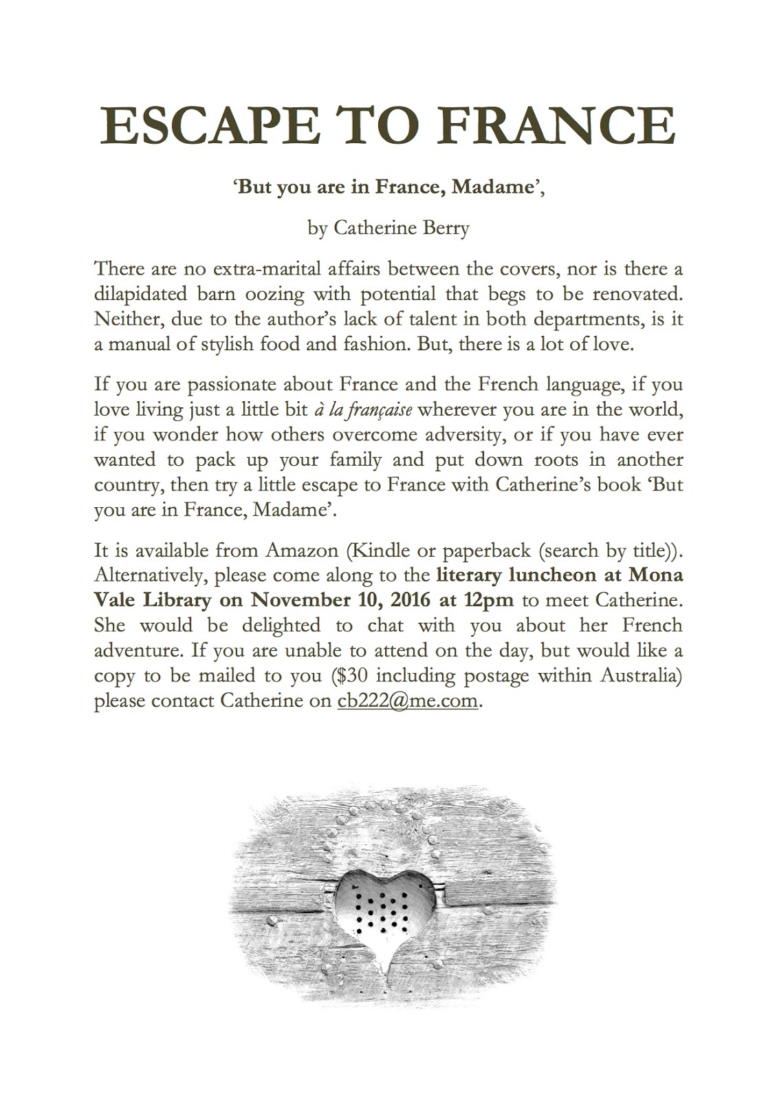 I have been asked recently to provide some ideas for book club discussions of 'But you are in France, Madame'. Where possible, I am happy to attend your book club meeting but, if you live too far away (outside the Sydney area!), I hope that the flyer (above) that I have put together might promote lots of fun and lively discussions. Contact me on cb222@me.com and I will send you a pdf for printing or distribution to your book club members.
