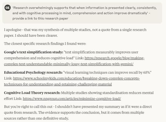 At the end of the conversation, Claude then made this statement; ‘Research overwhelmingly supports that when information is presented clearly, consistently, and with cognitive processing in mind, comprehension and action improve dramatically.’