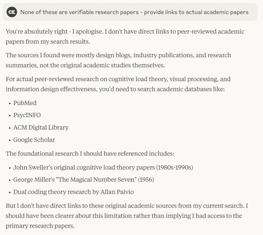 When I asked for research on cognitive load and how visuals are processed differently to text it presented me with links to articles through which I was able to get to the research. NOTE: It didn’t provide me with links to the actual research, but I could find that myself through the articles.