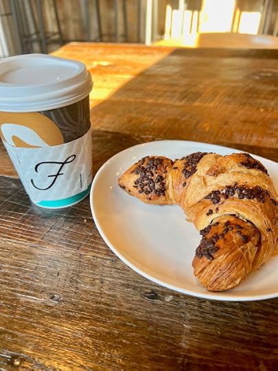 My friend Joanna and I meet up every few months at a local coffee shop, Foxtail Coffee, and when we met this week, I ordered my usual: a chocolate croissant and some tea. This time, it was their Southern Peach Tea, described as "high-quality black tea from the Assam Valley of India blended with ginger, peach, flower petals, and dried apricot pieces." It was delicious!