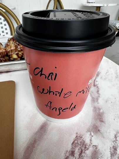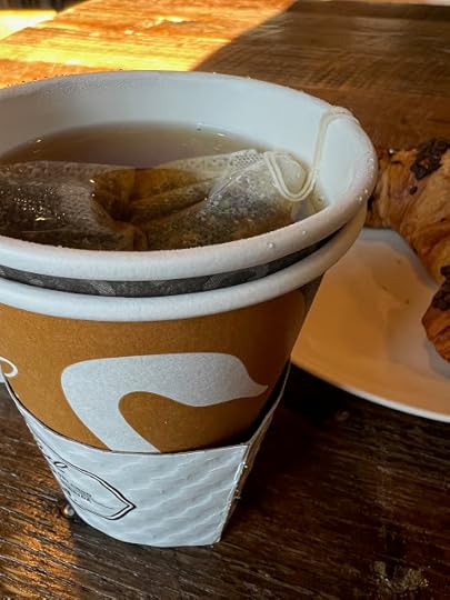 I love this coffee shop, but as so often happens in such shops, they steep the tea and leave the tea bag in the cup. This time, I was delighted to find my tea was double cupped. I don't know whether this was by accident or by design, but once I realized my tea tasted just right, I plopped the tea bag into the second cup. Problem solved. From now on, when I order tea in a coffee shop, I am going to ask for a spare cup so I'll have somewhere to place the tea bag!