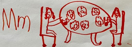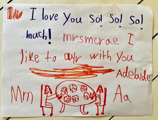 I promise that I won't share every single drawing my little neighbor makes for me, but when she rang the doorbell yesterday and handed me this and a hug, I was delighted! (And I love her "so! so! so! much!" too.) I'm pretty sure that word in the middle of the drawing means "color."