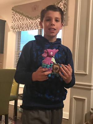 And while the boys stayed out of our way during the baking, here's Owen with a Fortnite toy that Luke tried to run off with.