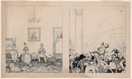 Have you heard of the cartoonist Rea Irvin? I had not, but he lived from 1881-1972, and according to the Library of Congress website, this cartoon of his was published in 1916. It's titled "A happy New Year 1867 - a happy New Year 1917."And here's the summary of the cartoon: "The 1867 panel shows a proper Victorian family -- father, mother, and little girl -- in their parlor, taking tea. The 1917 panel shows a riotous party in a restaurant with champagne corks popping, a man dancing on the table, two men playing leapfrog, and a heavy lady in a strapless dress drinking champagne. Irvin was a popular contributor of cartoons to Life (the humor magazine) before being named art editor of the New Yorker in 1925."