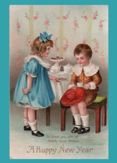 So I pulled out one of my old postcards to wish you all a Happy New Year, and I noticed for the first time that the little girl … well, is it just me or is she rocking a bit of a crazed look? No wonder the little boy is glancing to the side and looks like he's ready to take his teacup and run! Ha! Here's hoping your year is void of crazy people and that folks leave your tea alone. Happy New Year!