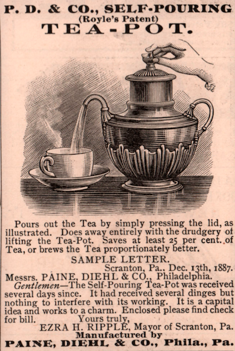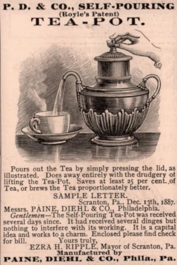 I was recently looking up some old advertising images online and came across this one for the P. D. & Co. Self-Pouring Teapot. I was frankly surprised I'd never come across this style of teapot before, and of course now I'd love to find one. (Preferably at Goodwill, and preferably for $2 or less.)Naturally, I Googled and found an amazing number of images of this teapot, in silver as well as chintz and other china patterns. I'm still just amazed that I'd never heard of this teapot before. I'm also puzzled by its claim that it "saves at least 25 per cent of Tea." Why would that be? Any guesses? If you've seen this teapot before, or perhaps even own one, I'd love to know more!