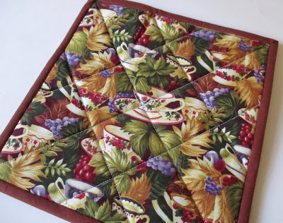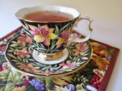 Dianne said she'd been looking for something tea-related to send me and found this recently at her garden club meeting, where some of the ladies are quilters. I think this is one of the prettiest pot holders I've ever seen, and I've never come across this gorgeous teacup fabric before.