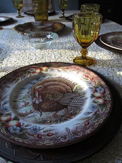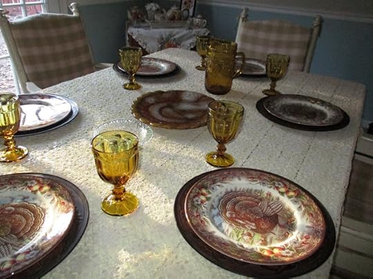 A tearoom-owner friend once told me that restaurants aren't supposed to leave dishes out overnight, but at my house, I do indeed set the table the night before. I love all my turkey dishes, and I had forgotten I own amber glassware until I opened the plastic bin Alex fetched from the garage. Once I got the tea pitcher on the table, it dawned on me that, ironically, I had not thought about making tea for Thanksgiving, so I added that to my list of tasks for Thanksgiving morning to be sure we had both sweet and unsweet tea for everyone. I didn't think to take photos of the food, but here was the menu, which is split between my sister and me: turkey and dressing, rolls, layered salad, broccoli casserole, green bean casserole, mashed potatoes, macaroni and cheese, sweet potato casserole, cranberry sauce, olives, deviled eggs, and chocolate chip, pecan, and sweet potato pies. Yum! (It's not technically accurate to say the menu included the deviled eggs, as I made them and then forgot to get them out of the fridge, but I did send the entire plate of them home with my sister, as I'm not a huge fan of deviled eggs, but everyone else is.)