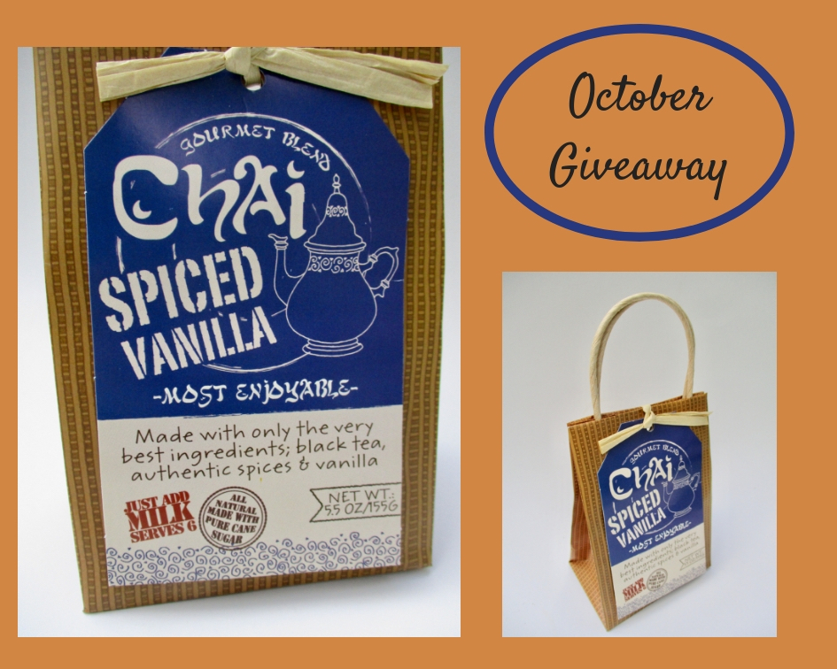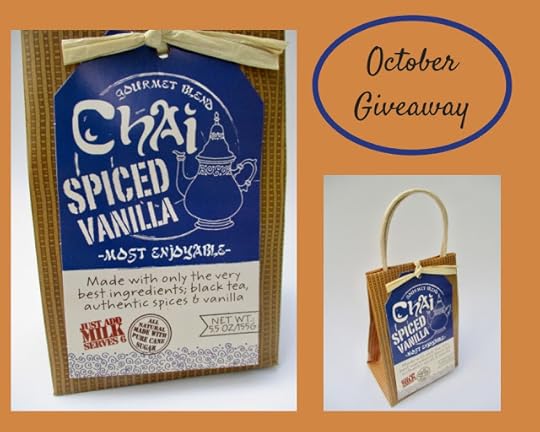 For the October giveaway, I picked up this cute bag of Chai Spiced Vanilla at T.J. Maxx over the weekend. All you have to do is add hot milk, and I've had this type of chai before and enjoyed it when I wanted a hot beverage that was a little thicker than just regular tea. So I'm hoping that one of you will enjoy trying this treat as well!If you'd like to win the the chai, simply leave an "Enter me" to this post between now and 7 a.m. EST on Thursday, October 11, making sure to include an email address so I can contact you if you're the winner, and you'll be entered to win. US only, please. Good luck!