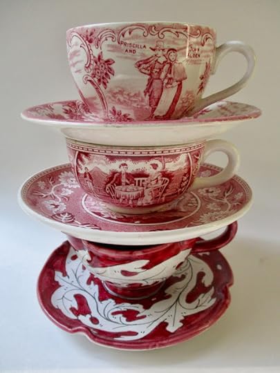 So Saturday was officially the first day of fall, but here in Georgia, it sure didn't feel like it. Do you know, the weather forecaster the other morning said that this year, we had more ninety-degree days in September than we did in August. I believe it! Still, knowing that it's officially fall gave me the go-ahead to start thinking about fall teas and tea wares. The other day, I happened to notice I had randomly stacked these three cranberry-colored teacup-and-saucer sets near each other in the tea cabinet. The one on the top was a recent find from Rome, Georgia, the one on the bottom was a souvenir from Rome, Italy, and the one in the middle came from eBay.