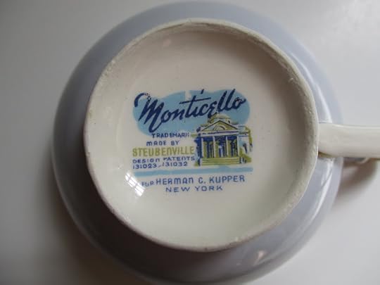 The backstamp! I'd heard of Steubenville but not Monticello made by Steubenville. That's got to be one of the most detailed backstamps I've ever seen, and I decided I had to do a little research. Steubenville Pottery Co. of Steubenville, Ohio, was in business from 1879-1959. The Monticello pattern was produced in the late forties and early fifties, and pieces were marked with a special backstamp listing the distributor, Herman C. Kupper of New York. I found an old ad for Monticello pieces, and it called these wares "Monticello—America's distinguished dinnerware" and said it was available at "better stores everywhere." I suppose so-called snob appeal has always been a selling tactic, yet how ironic that years later, I would purchase my Monticello secondhand.