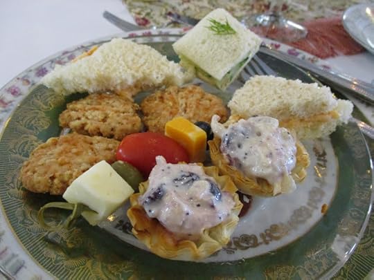The menu this year included Cheese Buttons, Cucumber Sandwiches, Pimiento Cheese Sandwiches, Chicken Salad in Phyllo Cups, and a Fruit and Cheese Skewer.