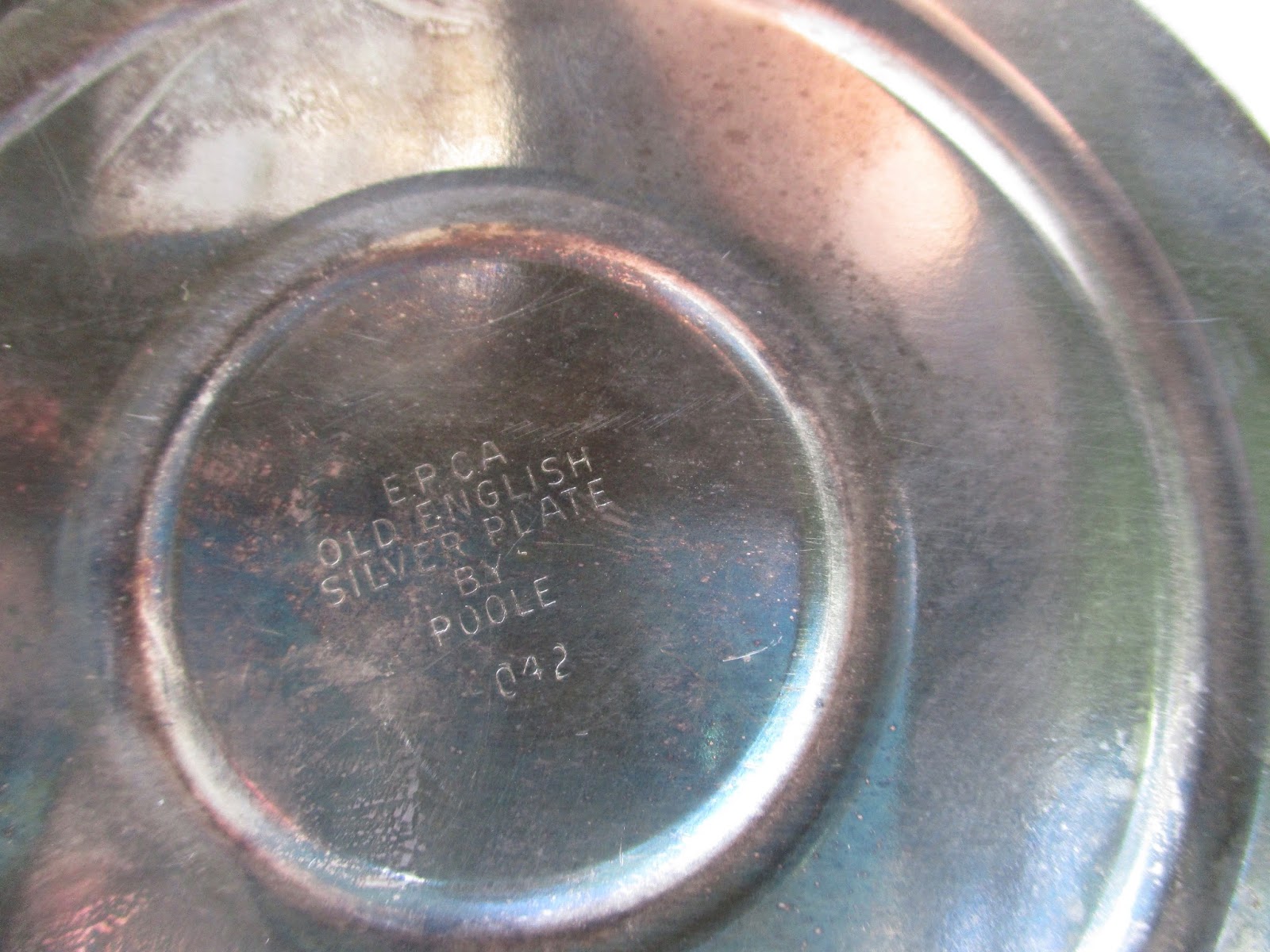 "Old English Silver Plate by Poole," it says, and I've purchased a fresh new container of Wright's Silver Polish so I can pretty it up. I believe Poole was a Massachusetts company, but I can't blame them if they, like me, like all things English!