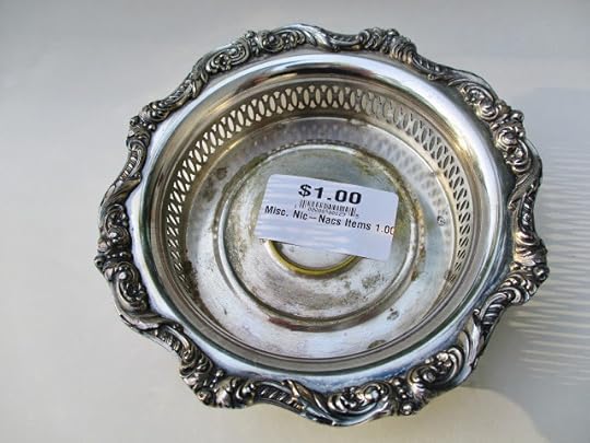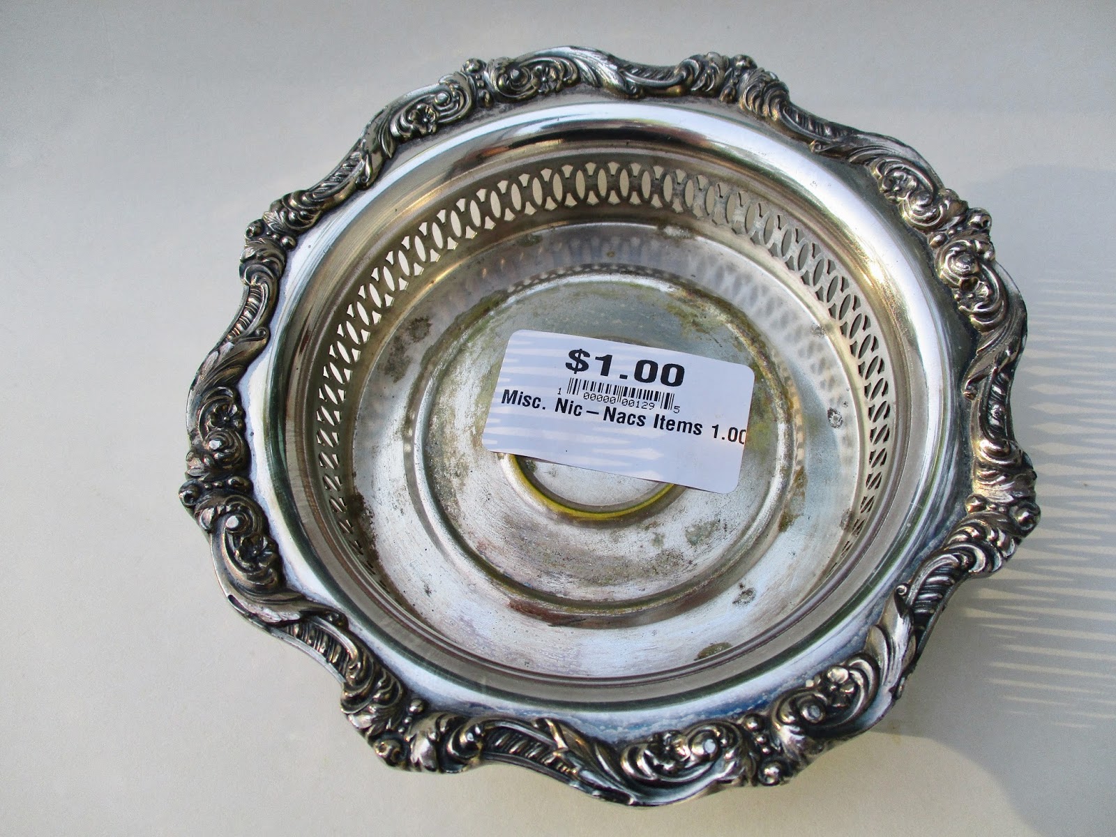 My bargain find for the weekend was an old silverplated dish I found at a new-to-me thrift store in Carrollton, the Blake House Thrift Store (it's near the Publix Shopping Center, if any of you locals are curious). If I had an antique store or a place to resell items, I would have loaded up there! They had beautiful glass-handled tidbit plates, china platters, a few teacups and teapots, and nothing was over about $4. But I'd been searching for a small candy dish, and I love the pierced design on this one.