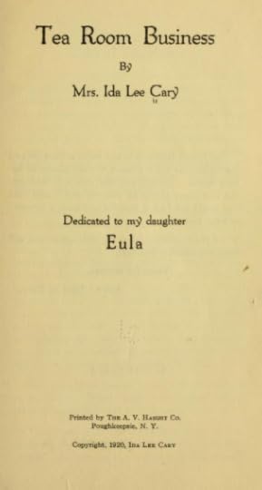 It's "The Tea Room Business" by Mrs. Ida Lee Cary, and I found it on the Library of Congress website through the link here. So 98 years ago, women were being enticed into the business world this way: "Tea Room Business is the most attractive and profitable way for a woman to earn money in her own home. Though married you will find you can buy many things for yourself and family that you could not buy if you did not have a business of your own."Mrs. Cary goes on to give some suggested menu items for your tea room, and it's clear that in 1920, this was more of the "country cooking" style of tea room than the tea-and-crumpets tea rooms we enjoy today. I was happy to see a chicken salad sandwich on the menu, though, although the "lettuce sandwich" didn't sound very appetizing. I wished the booklet included the recipe for the chocolate cake that Mrs. Cary says is "a great favorite with everyone," but a few more seconds of prowling the internet led me to this. More fun reading courtesy of Mrs. Cary and her tea room!