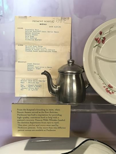 And then I read this: "From the hospital's founding in 1905, when Fannie Amster served as the first dietician, Piedmont has built a reputation for providing high-quality, nutritious food to help with a patient's recovery. Frances Wikle Whitaker headed the dietetics department from 1917 to 1926. This plate, pitcher and menu were used by Piedmont patients. Today more than 125 different patient menus are available at Piedmont." But the name "Frances Wikle Whitaker" got my attention because that is the woman who went on to open the Frances Virginia Tearoom, an Atlanta legend!
