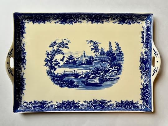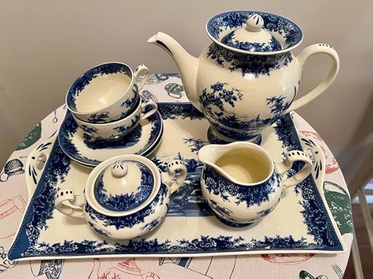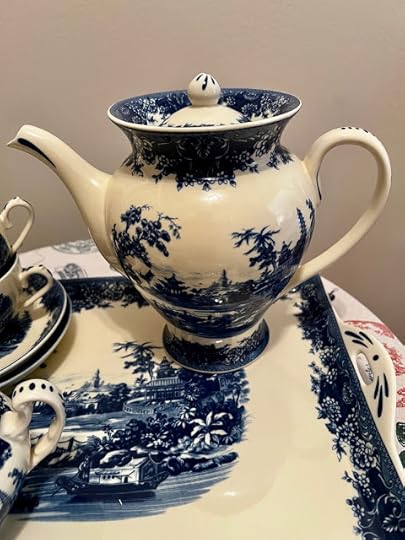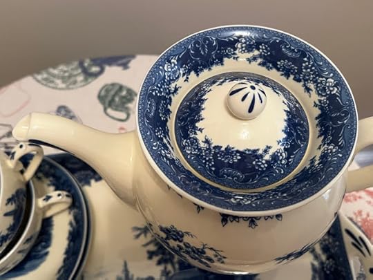 I guess you could say that a funny thing happened on the way to Wormsloe. I'd already breezed in and out of six state park gift shops by that point, but as a popular tourist stop, Wormsloe has a magnificent visitor center and gift shop, and this blue transferware tea set immediately caught my eye. I loved the shape of the teapot and that tray best of all but figured they would be too pricy for me. A teacup, maybe? I picked up one and it said $31.99, which seemed a little much for a single teacup. Then I looked again and realized it said $131.99. For a teacup? Have they lost their minds? But then I realized that was the price for the whole set! I stood there and dickered over it and decided I would make up my mind as I toured Wormsloe. And you can see what I decided, especially after finding that blue teapot in the Wormsloe museum.