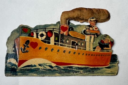 As longtime readers of this blog know, Valentine's Day is one of my favorite holidays, so I like to share some of my vintage valentines *and* host a few small giveaways each year around this time. Today, I'm sharing one of my newest vintage valentines, and while it's not dated, I suspect this ship-shaped valentine is one of the older ones in my collection, maybe from the thirties or forties. I love that the young man is serving this passenger her tea from a teapot with a heart on it! It reads, "My heart is anchored fast. It's yours, Dear Valentine."