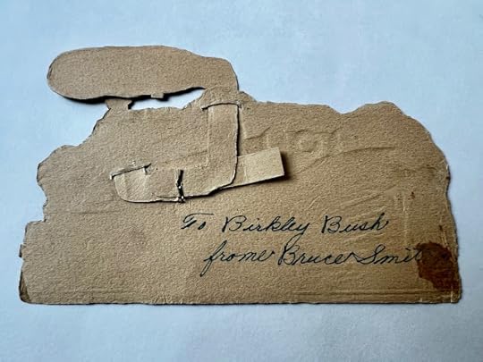 Maybe this was a card given from one classmate to another since it reads To Birkley Bush frome (sic) Bruce Smith. I think the brad on the back is supposed to make some of the pieces on the front jiggle, but I'm trying to be careful with that to avoid tearing them.