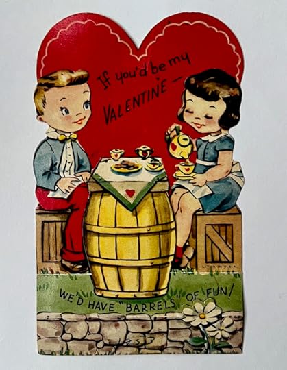 This is another of the tea-themed vintage valentines I've found since last year, and it's one I've never even seen before. It reads, "If you'd be my valentine, we'd have 'barrels' of fun!"