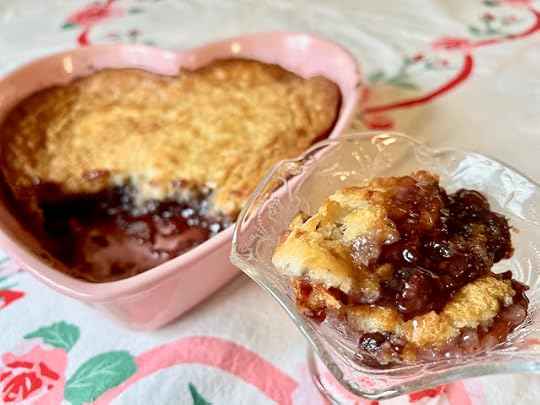 Preheat oven to 350 degrees. Melt butter in a 9 x 9-inch baking dish (I used a heart-shaped baking dish of a similar size). In a small bowl, mix sugar, flour, salt, and baking powder. Add milk to the dry ingredients and blend well. Pour batter over melted butter in pan. Add pie filling over the batter, dropping it by spoonfuls and evenly spacing it over the batter. Bake for 50 minutes to 1 hour or until golden brown.
