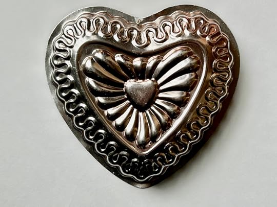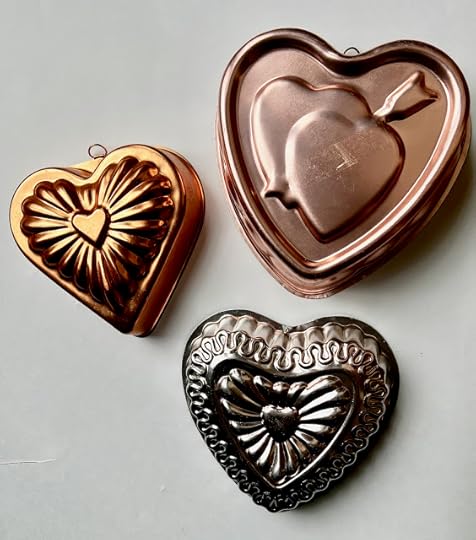 So here's the deal. Those lightweight copper-colored Jell-O molds are a fixture in every thrift store I've ever been in, and though I haven't made a Jell-O mold in, well, ever, I love these molds! I loved them even more when I discovered they can also be used as cake pans. That's why I have about a half dozen of them now, and I seem to find a new heart-shaped one every year around Valentine's Day.