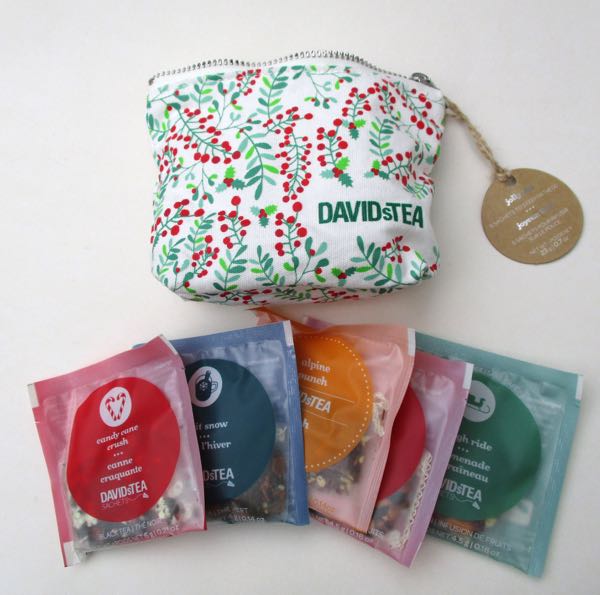 This month's giveaway is going to be a quick one, because I didn't decide on the giveaway item until late in the month, so this giveaway will run for only two days so I can hurry up and get it in the mail to the winner! I was placing an order with Davids Tea when I realized one of their tiny little zippered pouches of tea sachets would make a fun giveaway, so here 'tis: the winner gets this cute little zippered pouch containing Candy Cane Crush, Let It Snow, Alpine Punch, White Cranberry Bark, and Sleigh Ride teas to try! (And I'll be blogging about them after I try them for myself!)