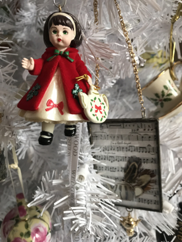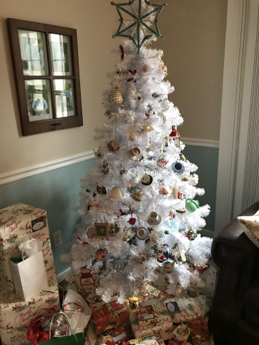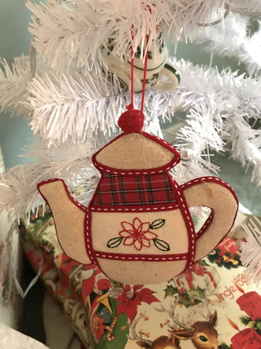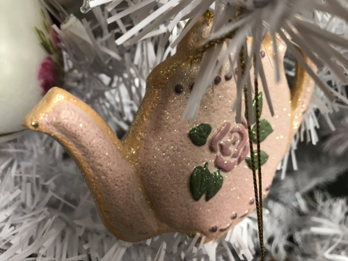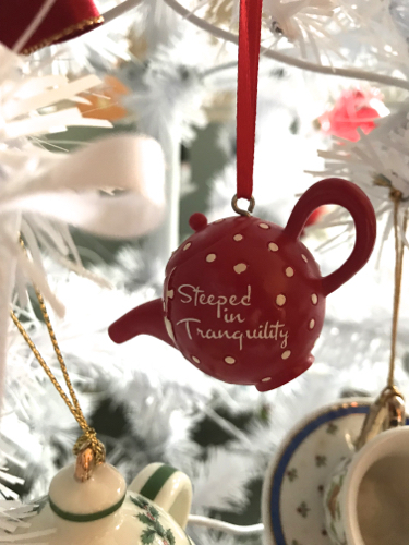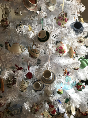 Christmas is just around the corner, and I realized I never shared any photos of my new white tea-themed Christmas tree. After buying a much taller tree than my little pink tabletop tree, I had assumed I wouldn't have enough teapot and teacup ornaments to decorate it, but it turns out that wasn't a problem!