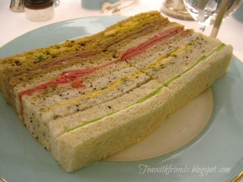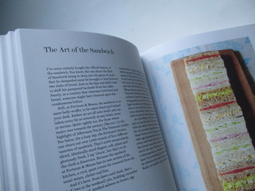 And I was irrationally happy, I suppose, to turn a page and discover a photo, preparation advice, and recipes for the very tea sandwiches I've eaten and loved at Fortnum & Mason! Here's an excerpt from "The Art of the Sandwich" page: "The process is as strict as it is unbending. Fresh bread, obviously. Fillings mixed fresh every few hours. Not too soggy or wet, as this would stain and sully the bread. And just the right amount of filling, about a quarter to half of the sandwich. Then they lose their crusts, and are sliced into soldiers of exactly the same proportions before being gently pressed, for 30 minutes, beneath a light wooden tray. Nothing is left to chance." Who knew!