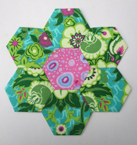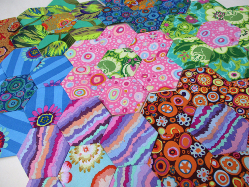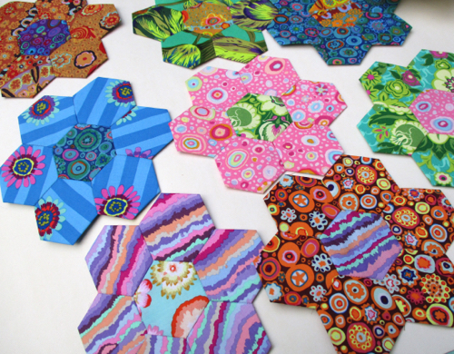 But then I saw a Pinterest photo of such a quilt with white hexies surrounding each flower. This gives you an idea of what that would look like, and I do believe it would highlight the colorful fabrics even more.