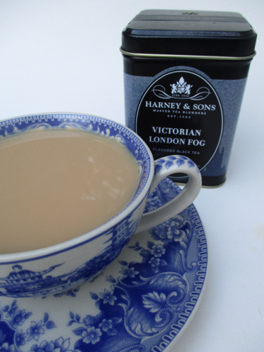 First, a few words about this thoroughly delightful new tea. I've had "London Fog" drinks in several tea establishments over the past few years. Harney says this tea was the winning blend in their Tea Blend Sweepstakes (how did I not know about that?), and that "the beverage called London Fog originated during the Victorian era. It is traditionally an Earl Grey served with steamed milk." So I added milk to mine and loved it!