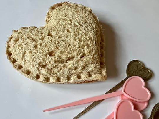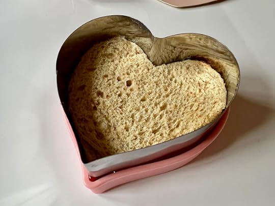 I was surprised to find there were no instructions in/on/with these pieces! So I went to the company's website, and it doesn't list the sandwich cutters. I googled sandwich cutters, and someone had made a sandwich using a similar mold, so I figured mine would work the same way. You use the larger heart to cut out two pieces of bread, add your filling (I used pimiento cheese), and make a sandwich. You plop the sandwich back inside then press down on it with the heart-shaped piece with the little ridges around the edge.