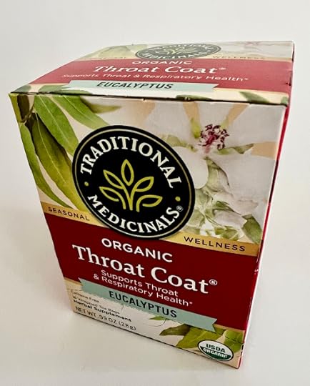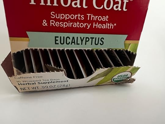 But of course that’s a minor point. The main thing was, does the Throat Coat in fact coat one’s throat? I’d say it did. With an arctic blast in Georgia for a second time this winter, I’ve been sipping loads of hot tea just to stay warm and keep any sniffles at bay. This tea tasted like it was packed with herbs, and indeed, the ingredients, all organic, include eucalyptus leaf, licorice root, spearmint leaf, marshmallow root, slippery elm bark, and licorice root dry extract. It had what I’ve heard described as a “thick” mouth feel, so yes, I’d say it coats the throat, and while this herbal tea is indeed heavy on the herbal flavors—rather than fruity or chocolatey or spicy or what have you—I liked it.