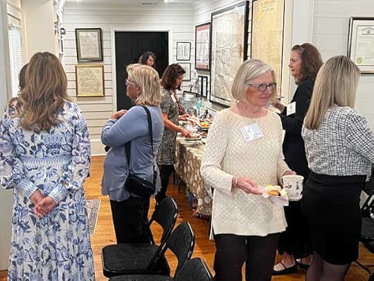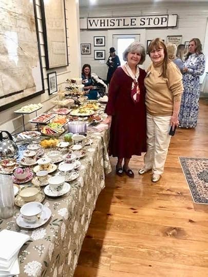 On Sunday afternoon, I had the great pleasure of speaking to a lovely group, the Atlanta Southern Crescent Alumnae Panhellenic Association (ASCAPA), which was celebrating its 24th Annual Founders Reception. They gathered at the Senoia Historical Society's headquarters in Senoia, Georgia. This town is very dear to me—I have ancestors in the city cemetery, and my great-great-grandfather was postmaster in the 1800s—so I am always honored to be invited to speak there. Here I am with Cele, the lovely woman who arranged my visit through a mutual friend. (The Whistle Stop sign is, I believe, a memento from the movie Fried Green Tomatoes, parts of which were filmed in Senoia.)