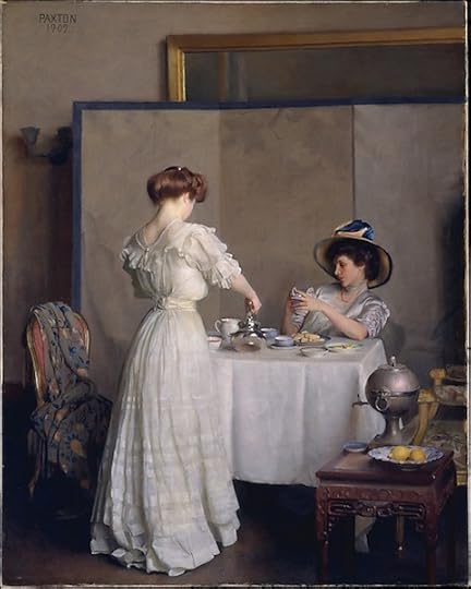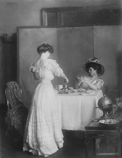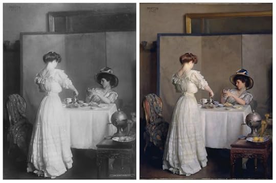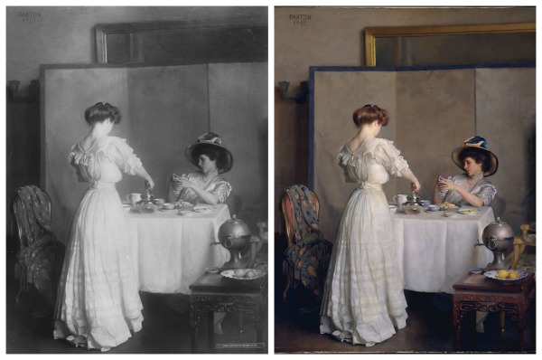 While I have great appreciation for black-and-white images, I came across both color and black-and-white images of some artwork that surprised me this week. As I often do, I was researching tea images on the Library of Congress website when I found the image at left, a photograph of a painting by William McGregor Paxton titled "Tea Leaves."