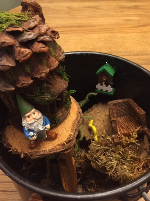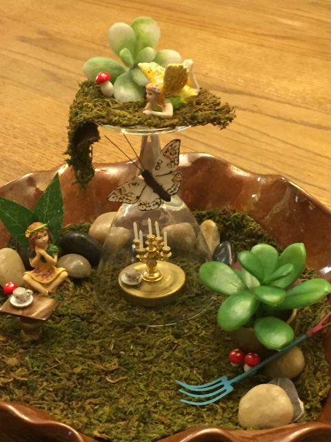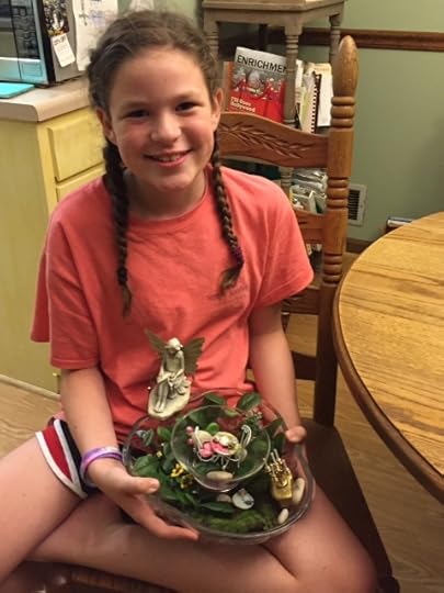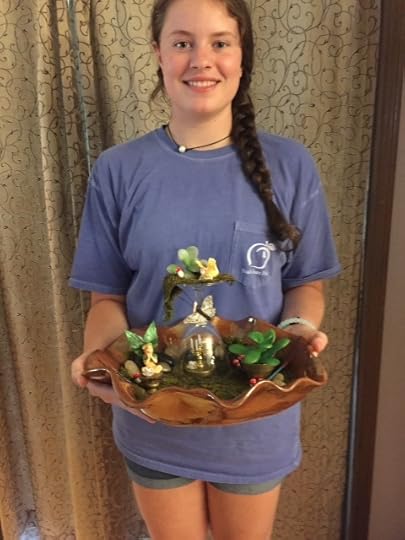 Here is Pam's granddaughter Lainey, 14, with her fairy garden composed in a beautiful ruffled container and sporting several levels of interest. I had not considered elevating a feature within a fairy garden, but what a great idea!