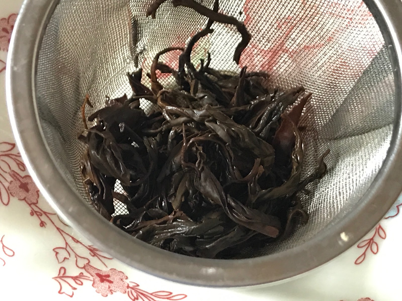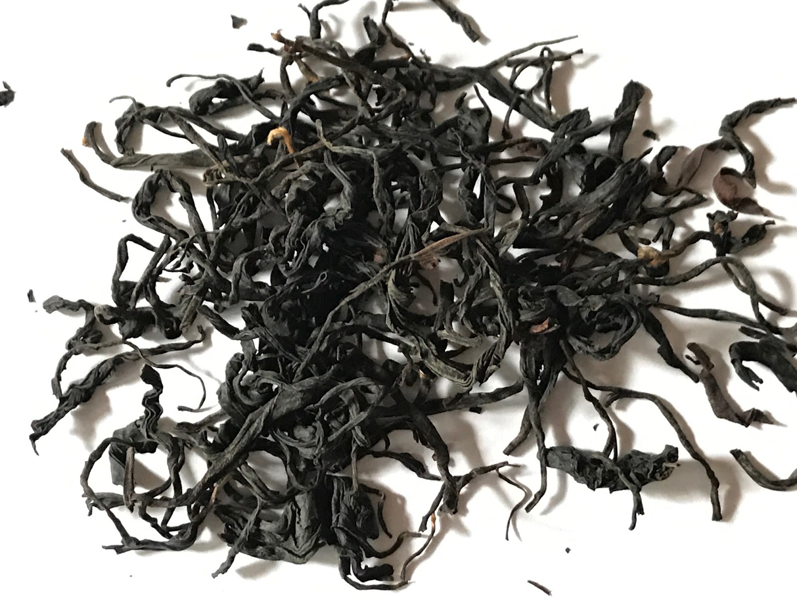 The thin, wiry leaves were a deep, inky black, with a few of those golden bits you find in Yunnan teas. Here's what the website says about this tea: "The local tea tree is Fengqing large leaf species, (which) can produce thick tea leaf. Our Ancient Wild Tree black tea then has large, strong leaves. The dry tea is glossy and dark, covered with thin pekoes. Its full aroma and bold taste can be revealed when brewed, as well as the particular strong taste which brings a characteristic of raw pu-erh to this black tea."