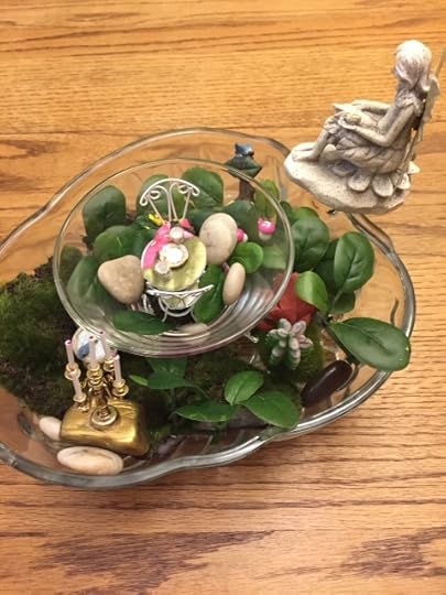 Eleven-year-old Saralynn made a fairy garden as well, and I'm so impressed that all three ladies made quite different styles of fairy garden. Pam searched thrift stores for bowls, she said, but the lovely fairy came from Pike's! (It had not dawned on me to search an actual nursery for fairy garden supplies. But of course!)