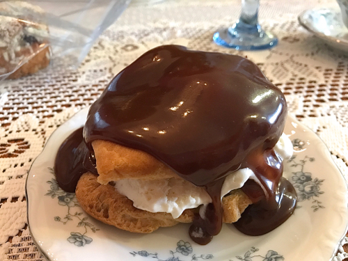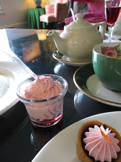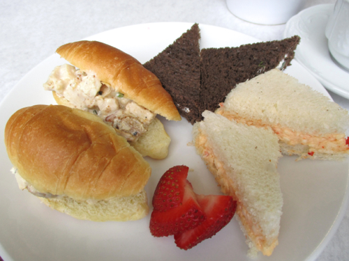 Frankly, I'm not sure any of us had any idea what this particular "afternoon tea" would be like, we just knew we were game to try it. To make sure I was good and hungry, I'd eaten only a pastry for breakfast, so I was famished by the time 2 p.m. rolled around. The sandwiches came not on a three-tiered server but on individual plates. The flavors were chicken salad on mini croissants (my favorite), a cucumber and dill cream cheese, and pimiento cheese. They were quite filling.
