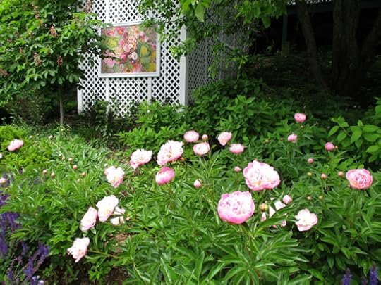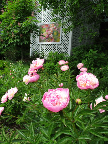 These beautiful peonies with a gorgeous piece of artwork in the background.