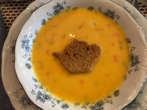 We started with Canadian Cheddar Cheese Soup topped with a teapot crouton. Isn't that charming? The soup was delicious and far superior to that cup of water and pretzels I'd had on the flight!