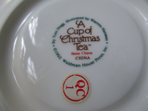 This set is in such great condition that even the sticker on the bottom of the saucer appears pretty unworn. I was delighted to find this lovely set, and it will join another of these sets found at an antique mall for $12.99. (And I had thought that was a great price!) I note with interest that it's the 25th anniversary of the Tom Hegg book upon which this pattern is based, A Cup of Christmas Tea. Maybe those of us who consider ourselves fans of the book—and of tea—should do something special to celebrate. (Ideas?)