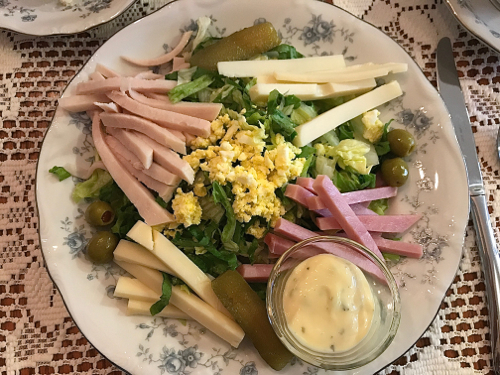 Our main course was this amazing Maurice Salad, a specialty of the former Hudson's Department Store in Detroit. Phyllis and I both love old department store restaurant and tearoom recipes, and she has become quite the expert on all things Hudson's. I've made this salad myself several times before, but enjoying Phyllis's amazing version of it was the perfect lunch for my first day in Michigan—and a meal with great sentimental meaning to Phyllis and me.