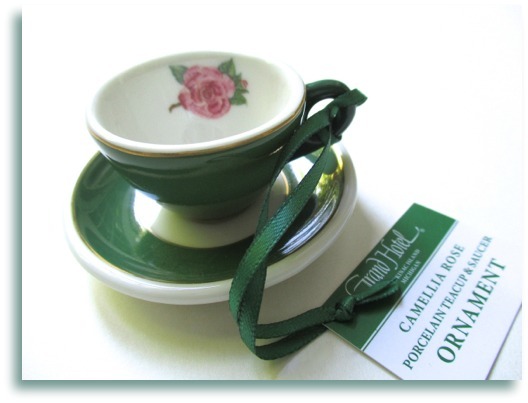 You won't be surprised to hear that my favorite souvenir from this trip is the one I'll bet every tea lover gets, the teacup and saucer ornament in the signature Camellia Rose pattern.