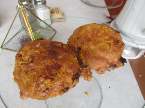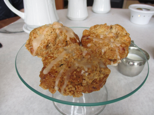 Interestingly, our server then came back to take our "scone order." I don't guess I've ever ordered my scone at teatime, so I found that intriguing. (Not bad, mind you, just different.) Our choices were Apple Crumble and Strawberry Shortcake, and three of us ordered apple, and two, including me, ordered the strawberry. These were the Apple Crumble scones.