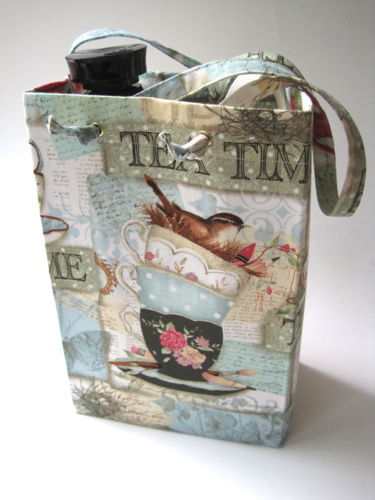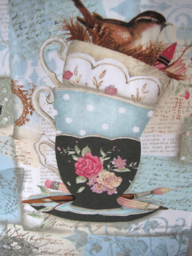 But oh, this fabric! Here's the other side of the bag, and you'll note the vintage drawings of teacups at bottom right, one used as a pincushion and one with a little bird visiting. I'm keeping my fingers crossed that some overeager seamstress purchased an extra yard or two and will have it on eBay soon!