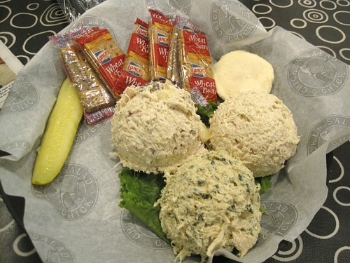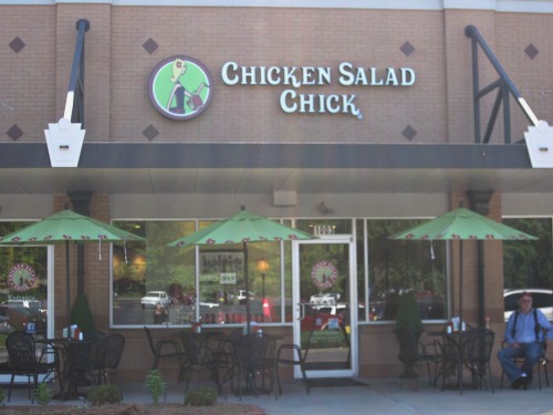 Yesterday I finally made it to Chicken Salad Chick, and I'm now a fan! I first heard of this new Southern chain restaurant a couple of years ago, but there wasn't one nearby. The few times I passed one in the Atlanta area, I was busy shopping and not in the mood to stop by. But one of the restaurants opened in Peachtree City, and I met my friend Ruth for lunch there yesterday. I was eager to go because I've rarely met a chicken salad I didn't like. I think if the cucumber sandwich is the number one choice for teatime, then the chicken salad tea sandwich must surely own second place!