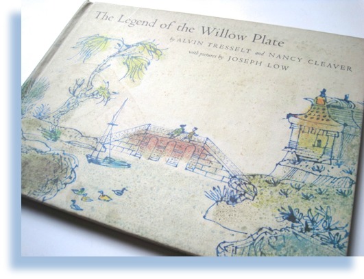 So May is my birthday month, and I have already received in the mail a delightful package of goodies from my tea-loving pen pal in New York, Sandy. All the gifts were lovely and most welcome (and will no doubt show up in other blog posts), but I had to tell you about the item I will treasure most: a 1968 book that belonged to Sandy's mother, The Legend of the Willow Plate by Alvin Tresselt and Nancy Cleaver with pictures by Joseph Low. Knowing that this book once belonged to Sandy's mother makes me treasure it even more!